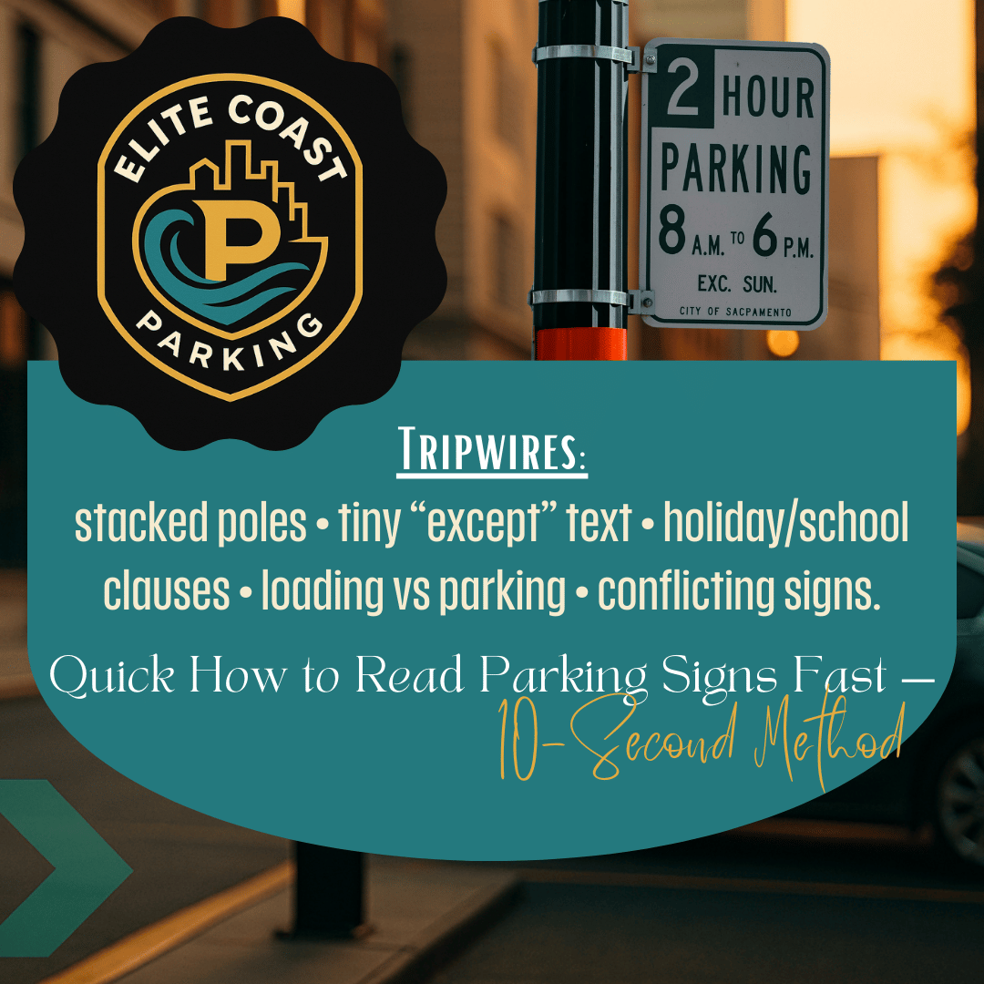 Stop guessing. Use Elite Coast Parking’s 10-Second Sign Stack to read any parking sign, avoid tickets, and park with confidence.